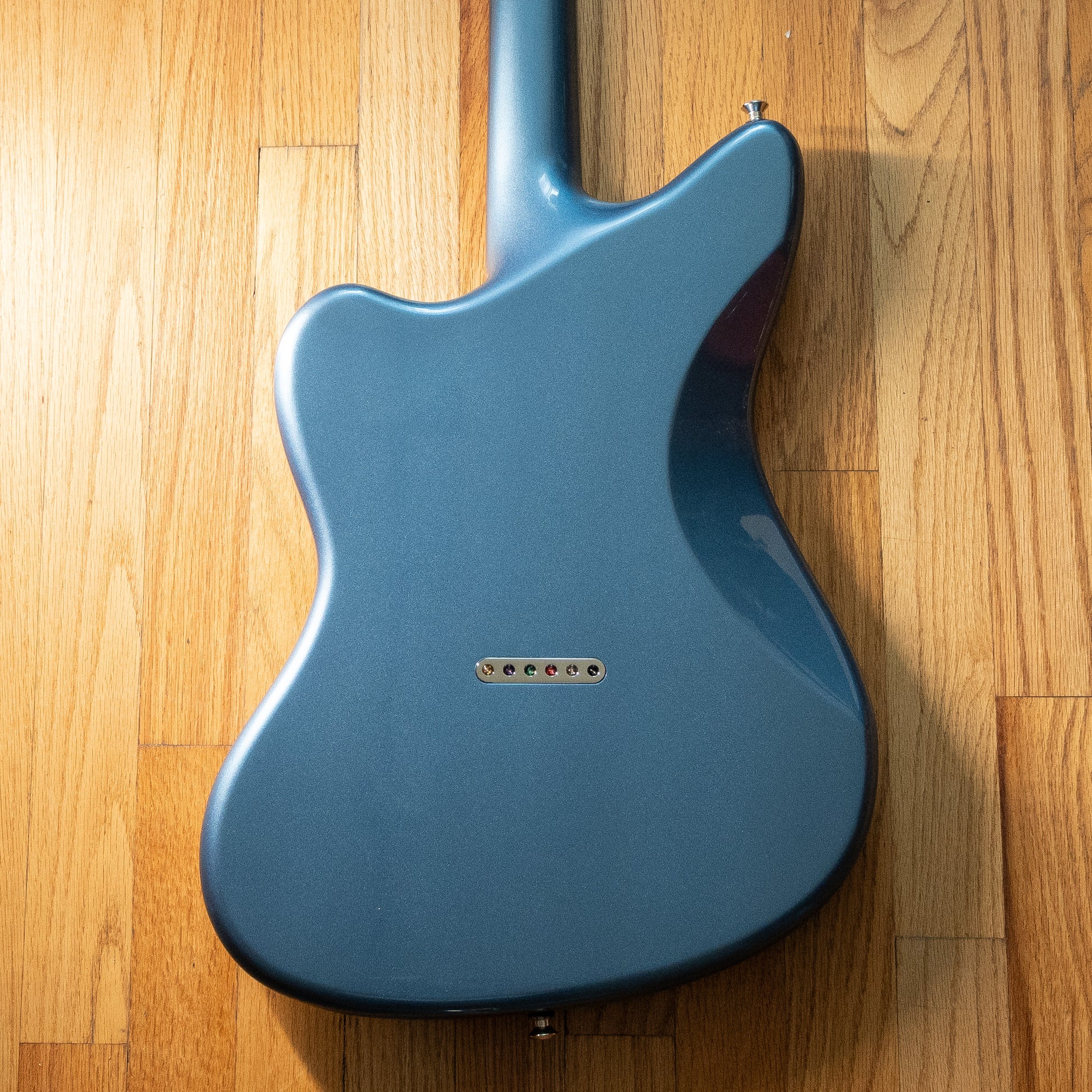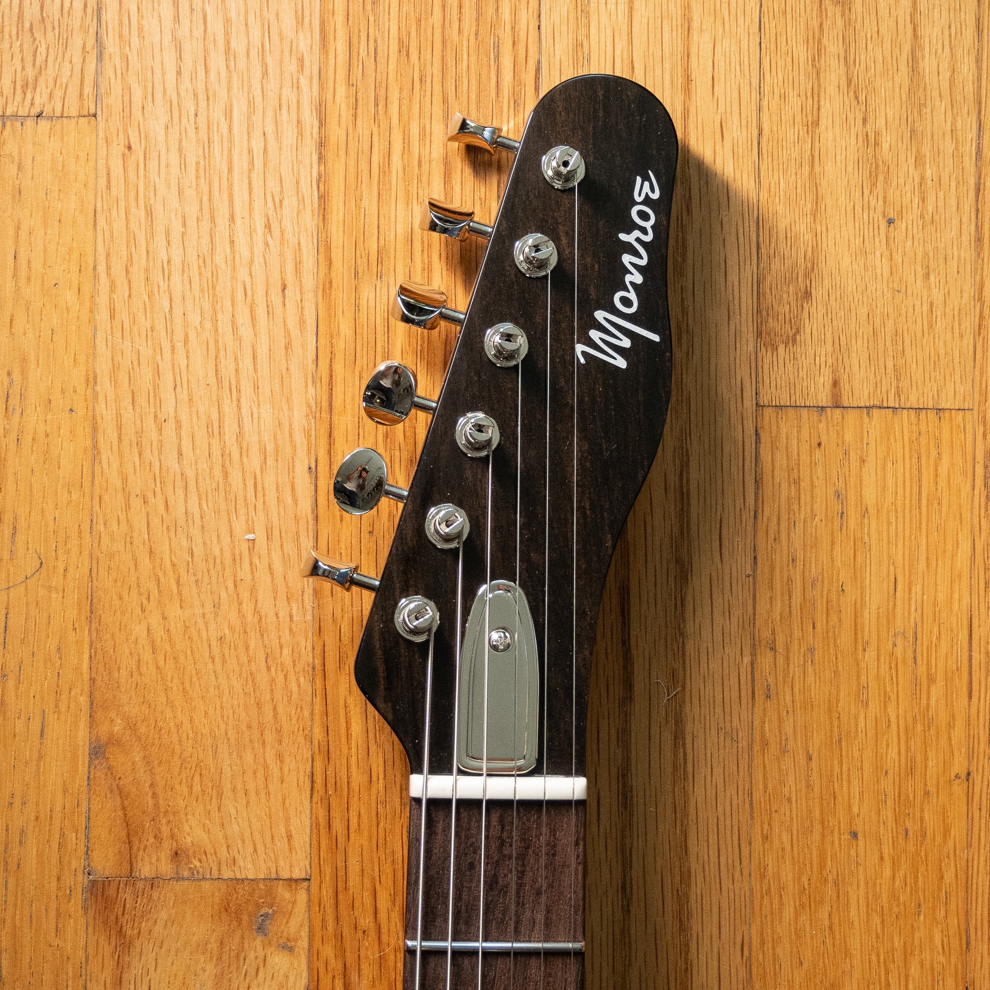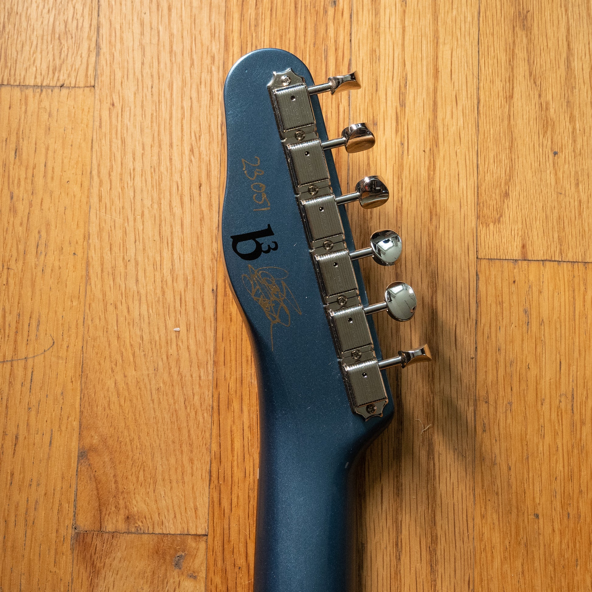 This model is a play on the now classic b3 Phoenix but with an offset body. We worked directly with b3 in the design the Monroe, down to the very name, to combine a hybrid of the comfort of the offset body and the power and resonance of a set neck! The results are truly stunning as you can see in this example which features a Pelham Blue over Gold over Three Tone Sunburst finish over a Black Limba body. This Monroe is voiced with Lollar Imperial Low Wind Pickups and utilizes the b3 half T string through bridge. This is the production prototype, which makes it extra special!