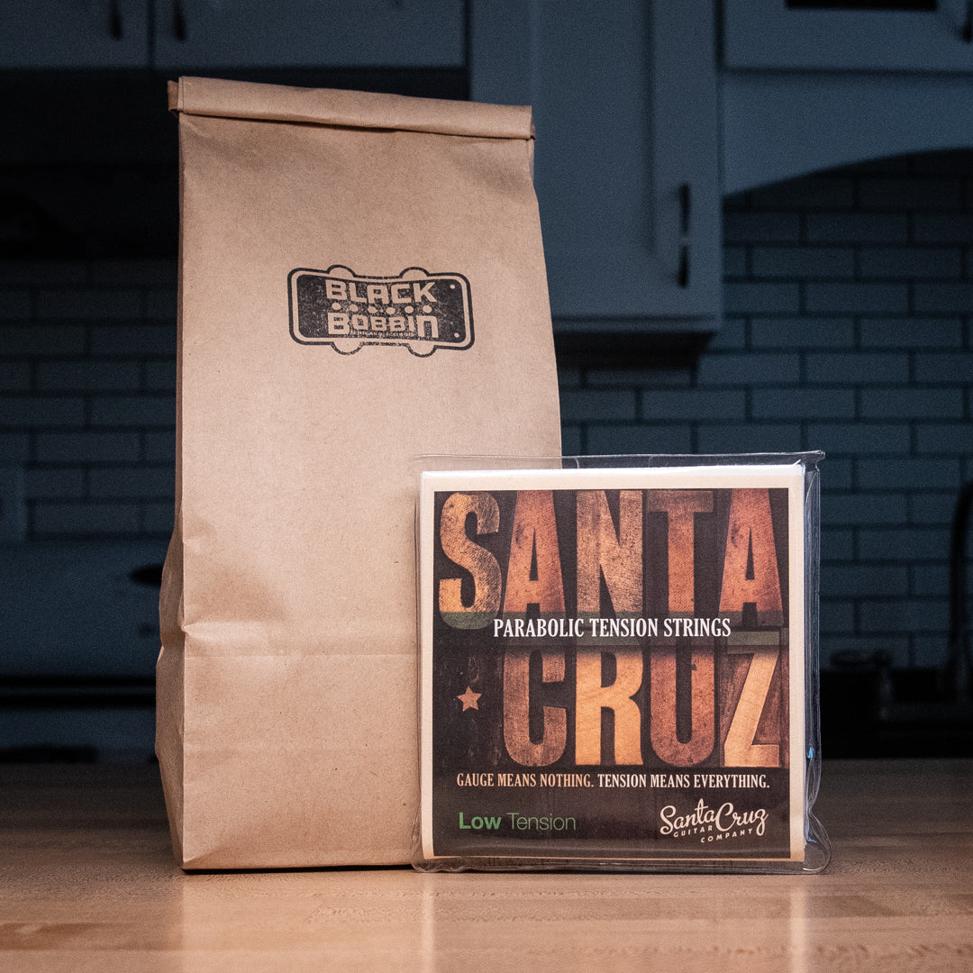 A Perfect gift for the acoustic guitar lover in your life, this bundle contains a 12oz bag of our "1 Meg" blend, and a set of the Santa Cruz Low tension acoustic strings. These strings are perfect for small body size guitars!
