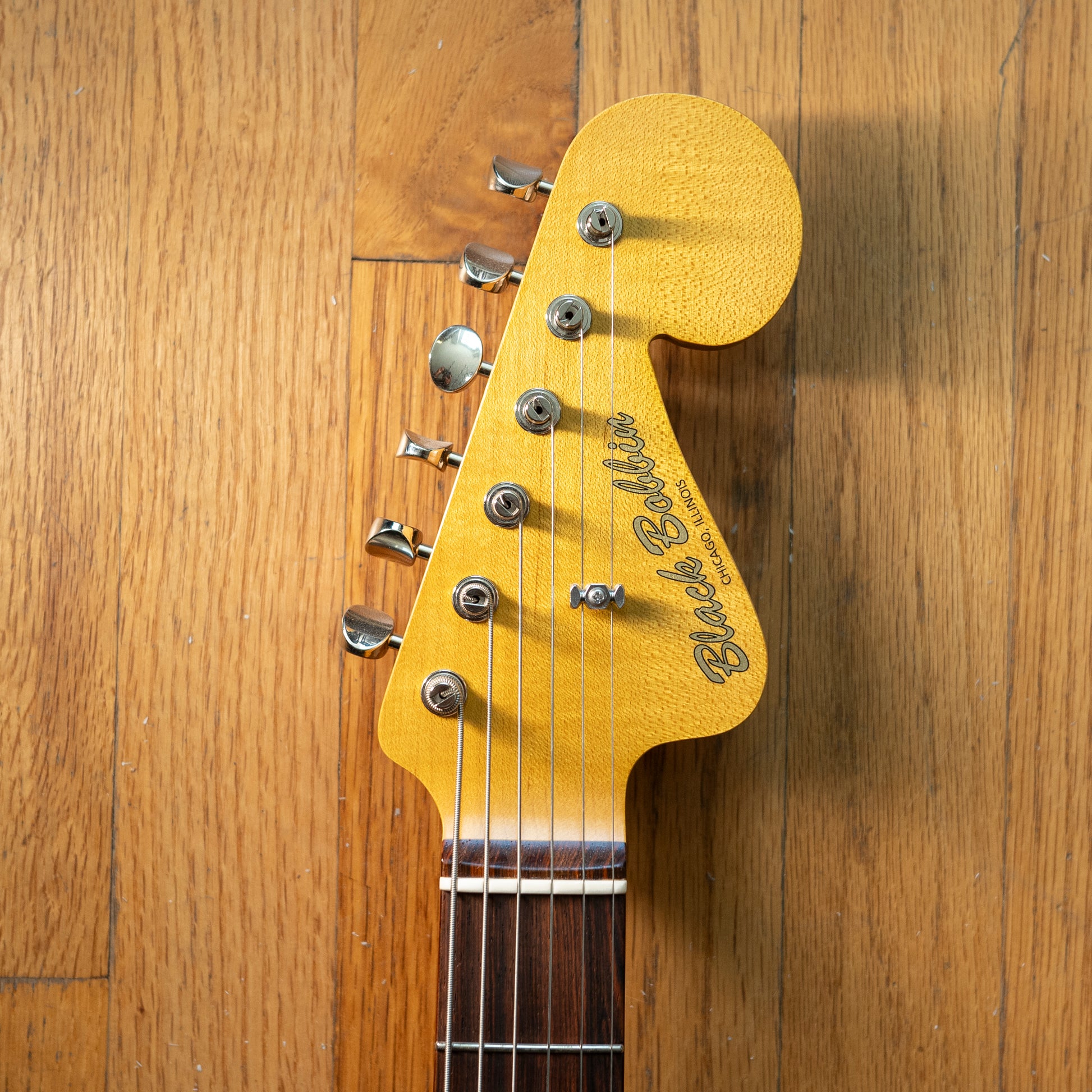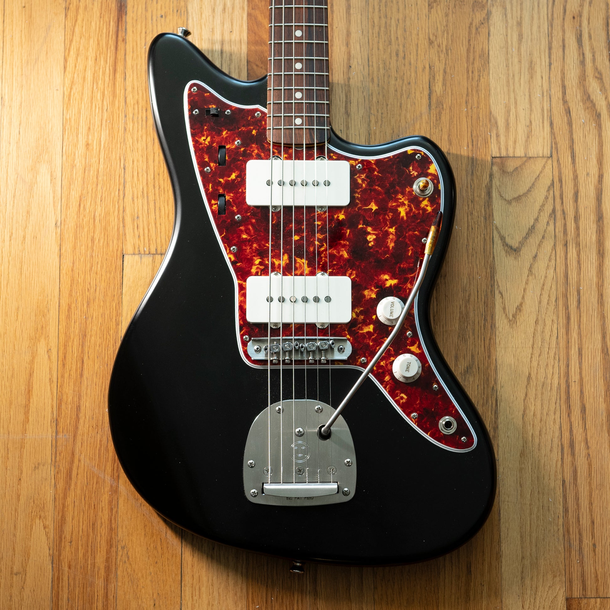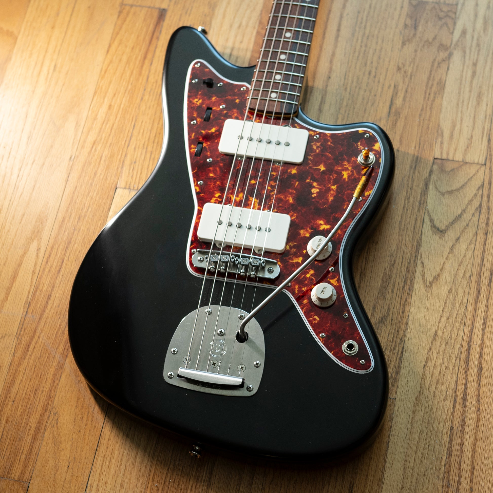 A very fine example of an early Black Bobbin JM in Black with a Spitfire Tort Guard, and an upgraded Brazilian Rosewood fretboard! There is a small blemish on the headstock from hanger rash. In great shape and includes original hardshell case!