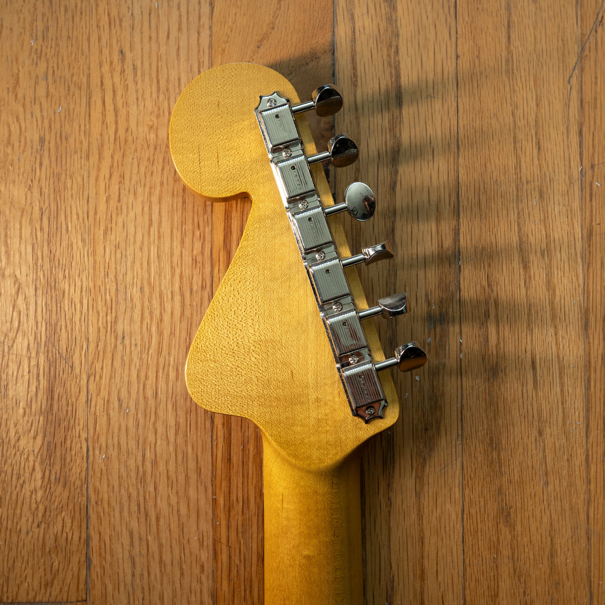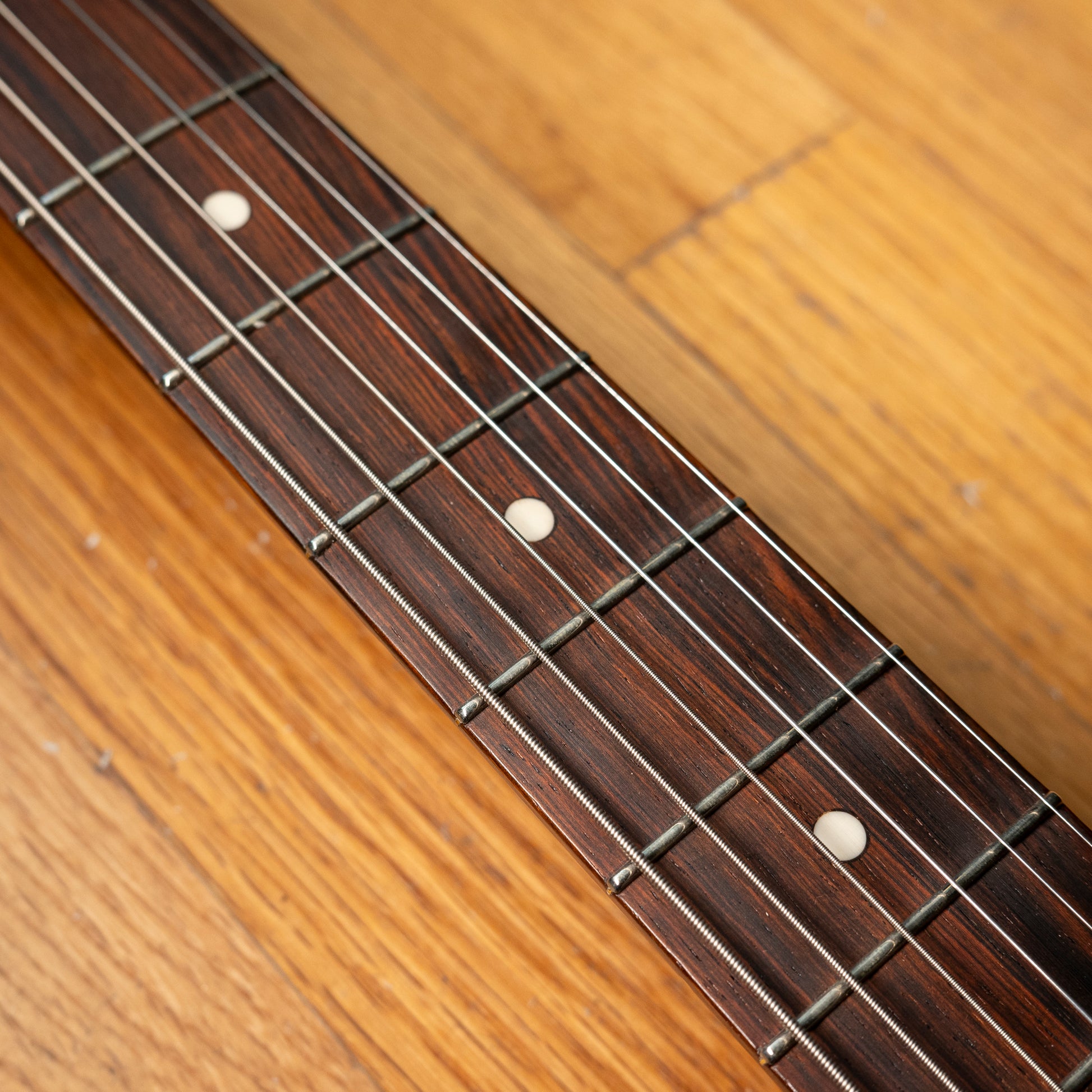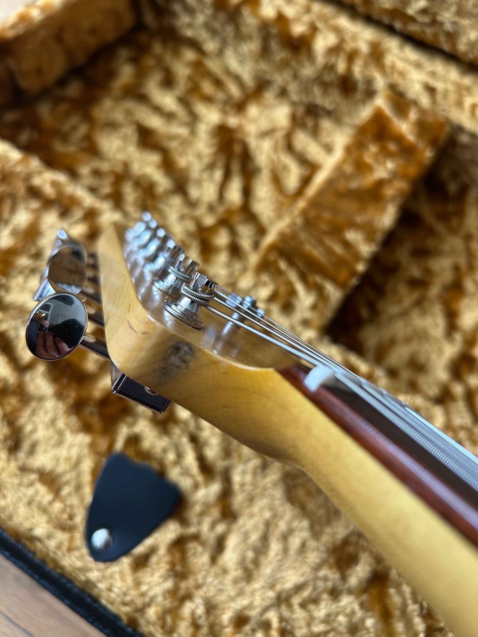 A very fine example of an early Black Bobbin JM in Black with a Spitfire Tort Guard, and an upgraded Brazilian Rosewood fretboard! There is a small blemish on the headstock from hanger rash. In great shape and includes original hardshell case!