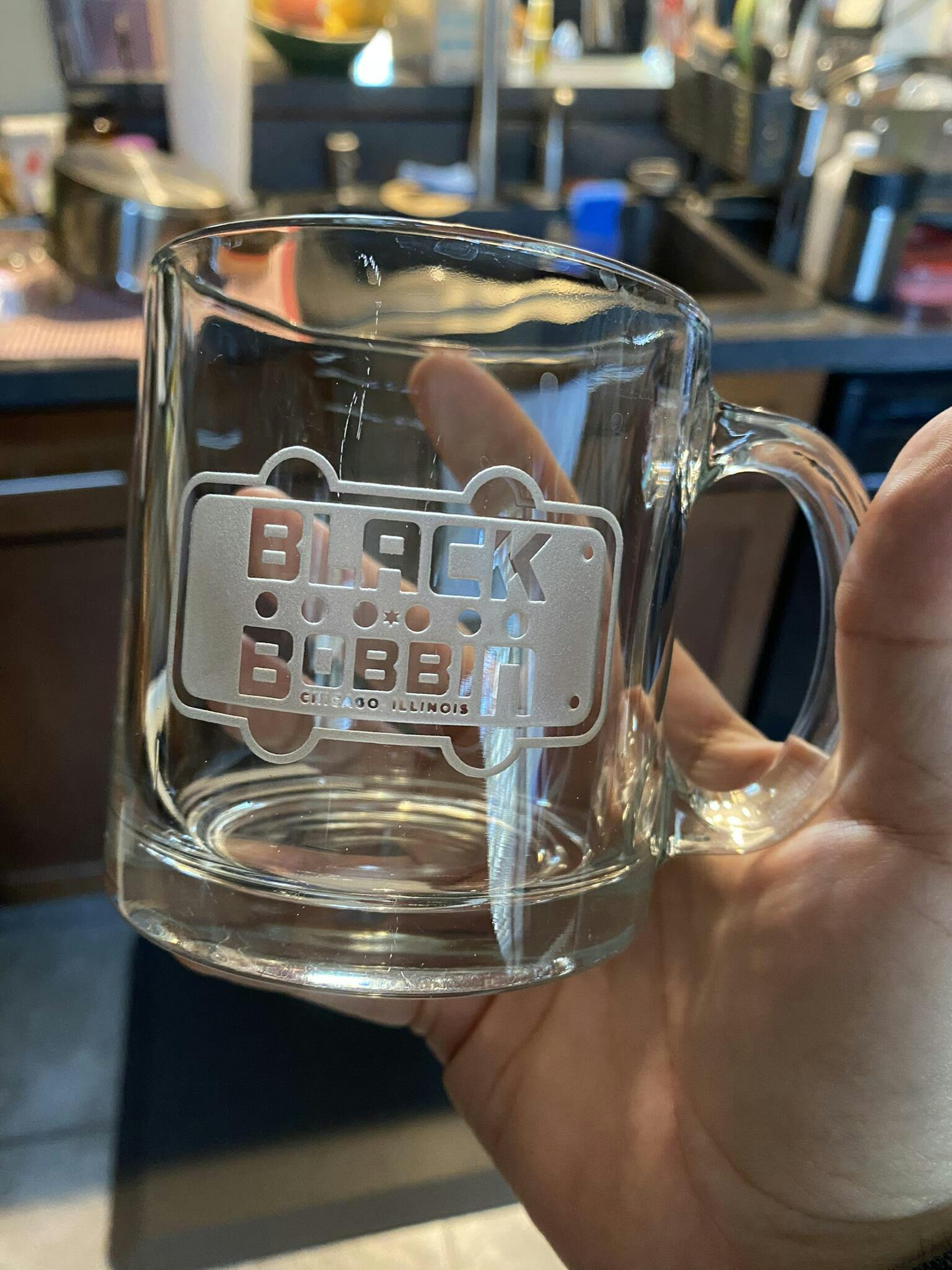 Check out our 13oz tempered glass mug with etched Black Bobbin logo. Heavy weighted, very classy, and perfect for drinks of all kinds!