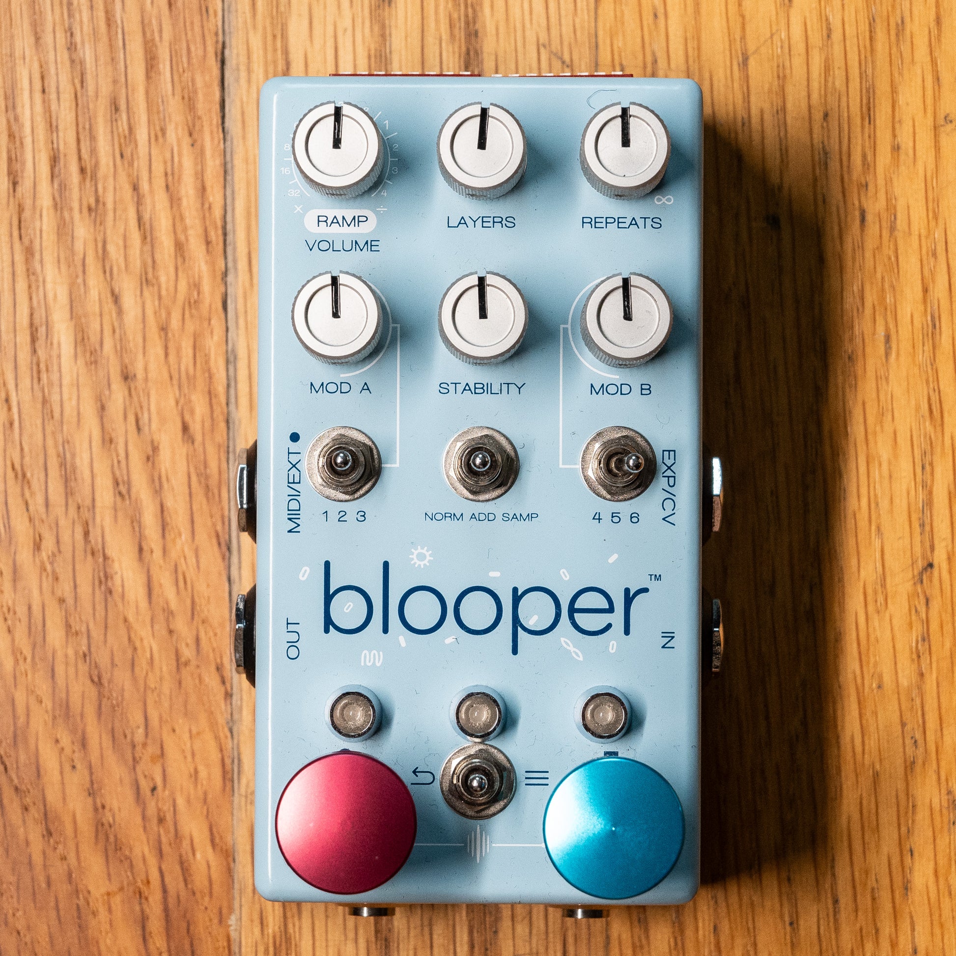 With six knobs, four switches and two push-buttons, Blooper gives you total control over every aspect of your sound. The Volume or Ramp knob primarily controls loop volume, but can also be used to modify the Layers, Repeats, Mod A, Stability, and Mod B settings. The Ramp settings can be set to modulate or ramp-and-hold using the 16 dedicated dip switches on the back of the pedal.