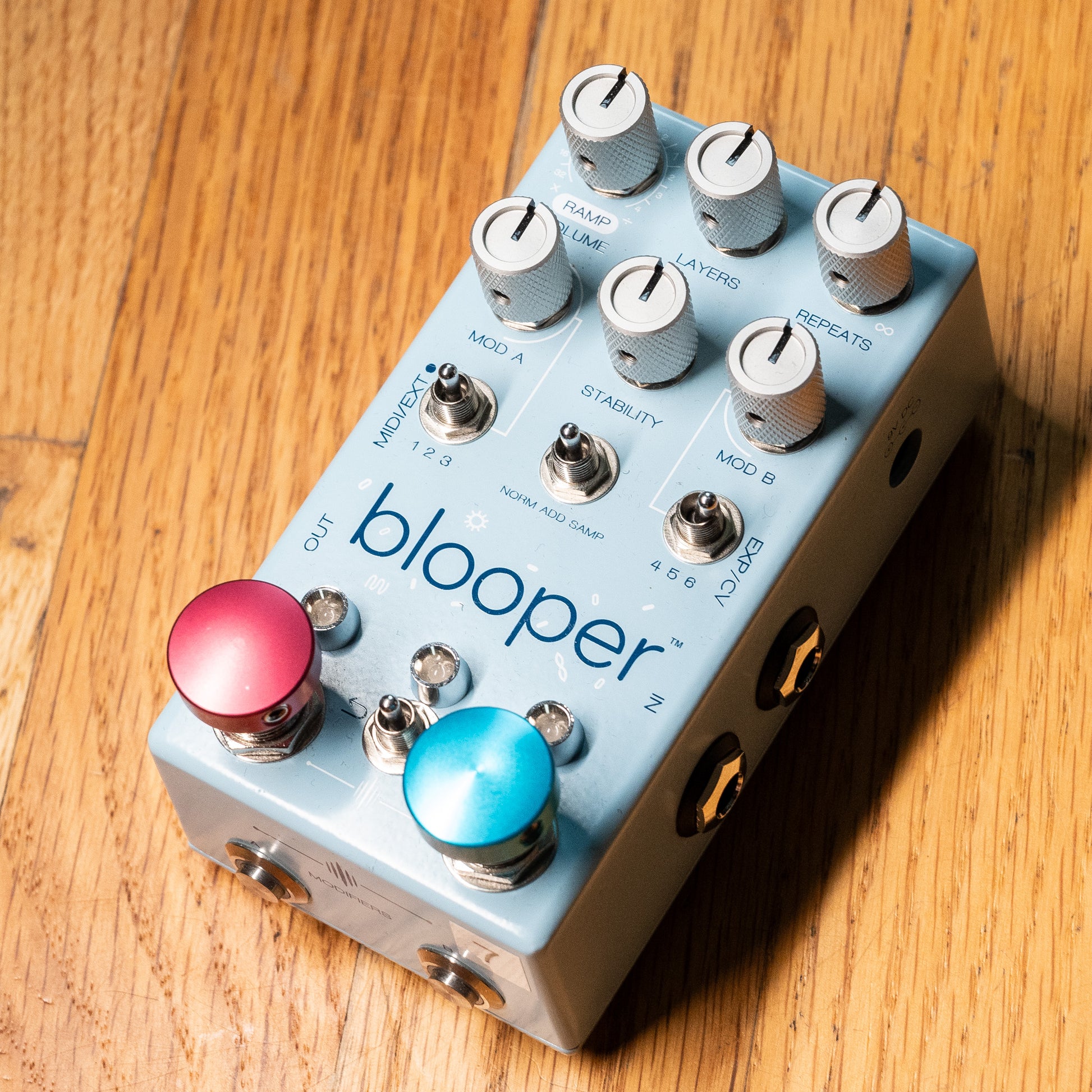 Blooper has two channels of modifiers, activated by buttons on the bottom of the pedal. These buttons can be used as a momentary effect by holding them down, or standard on / off with a quicker press.