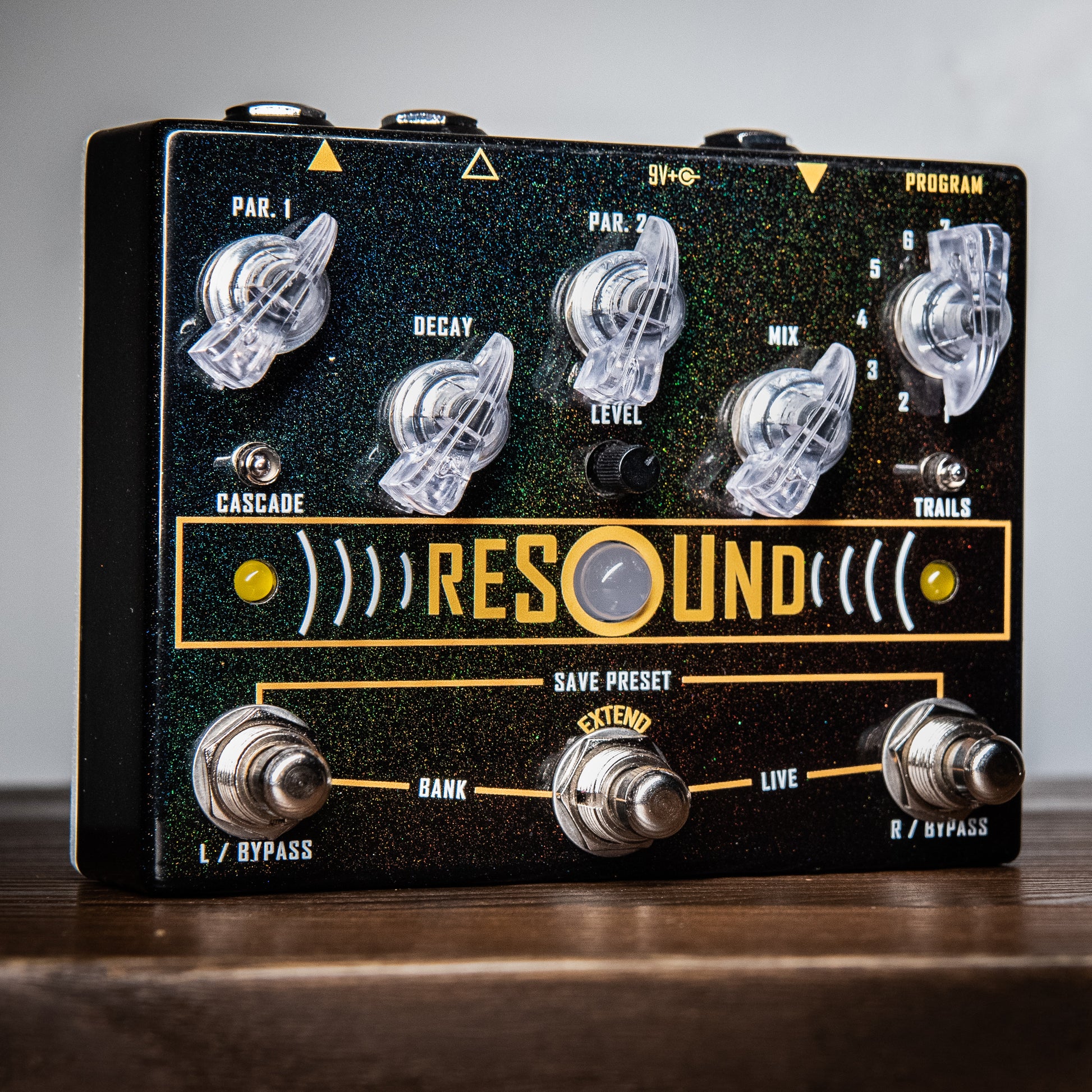 The Cusack Music Resound is a digital reverb pedal based around the popular Spin Semiconductor FV-1 microprocessor. It comes loaded with eight different reverbs, the ability to save up to eight presets, and an "Extend" switch to help create complex ambient landscapes. Beyond great reverbs, the Resound is also capable of rich chorus, freeze, 12-string simulation, and near infinite decays!