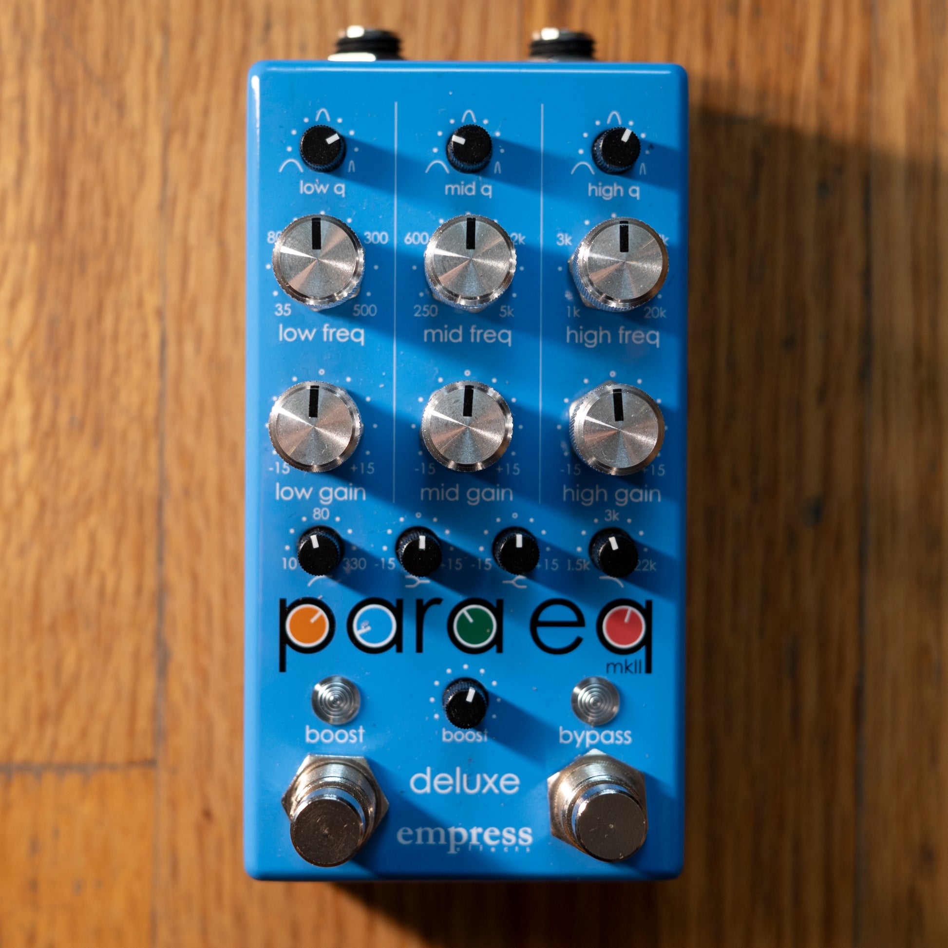 The Empress ParaEQ MKII Deluxe packs four new filters and vastly improved Q controls into a box half the size of the original ParaEQ! From the +/- 15dB boost/cut on all three bands to the extended adjustability of the fully sweepable Q controls, this pedal’s slimmed-down size makes no compromises over the original unit, and it’s even been upgraded with a vastly improved headroom. In fact, the ParaEQ MKII Deluxe’s 107.9dB signal to noise ratio, 0.03% introduced distortion, and 27V functionality deliver a clear, noise-free sound that’s simply unprecedented in a stompbox format. A 30dB boost section rounds out the ParaEQ MKII, providing everything from a subtle push to a long signal chain, to taking your favorite tube amp into raunchy overdrive territory. A worthy addition to the trailblazing Empress catalog of pedals, the ParaEQ MKII shatters the limitations of stompbox equalization!