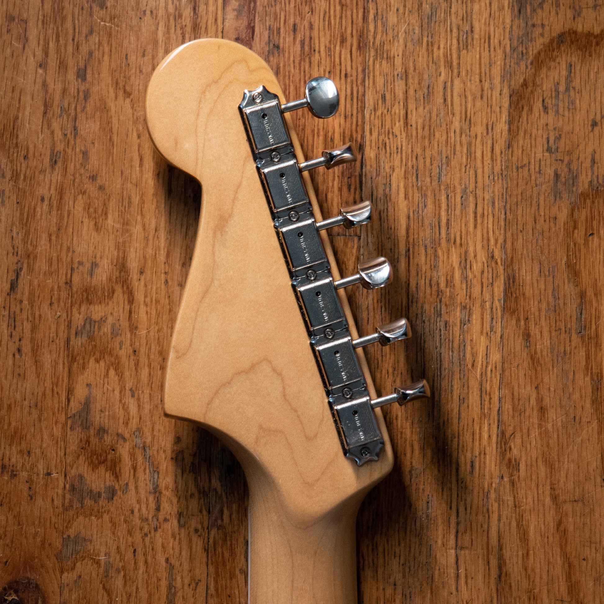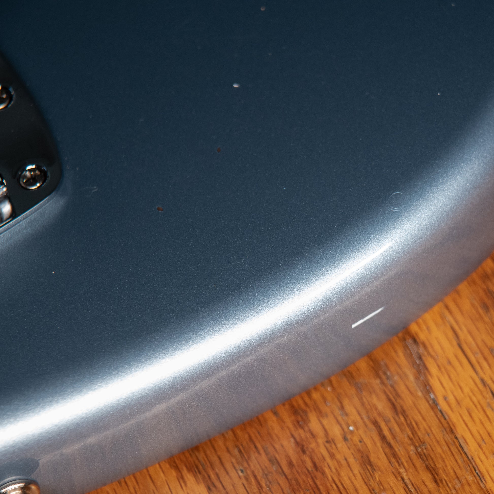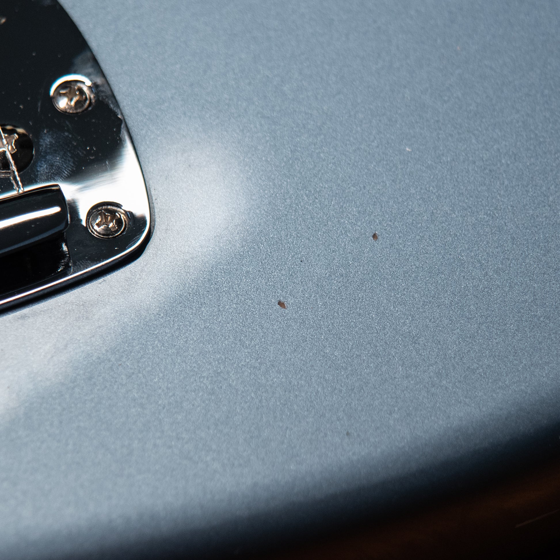 Ice Blue Metallic surely must be one of the greatest finishes! This American Original Jazzmaster is a great playing guitar, and would be perfect for our Makeover Kit! It has some blemishes across the body which are shown below, but is in otherwise great shape. The original tort guard has been replaced with the parchment, but can be changed back if desired!