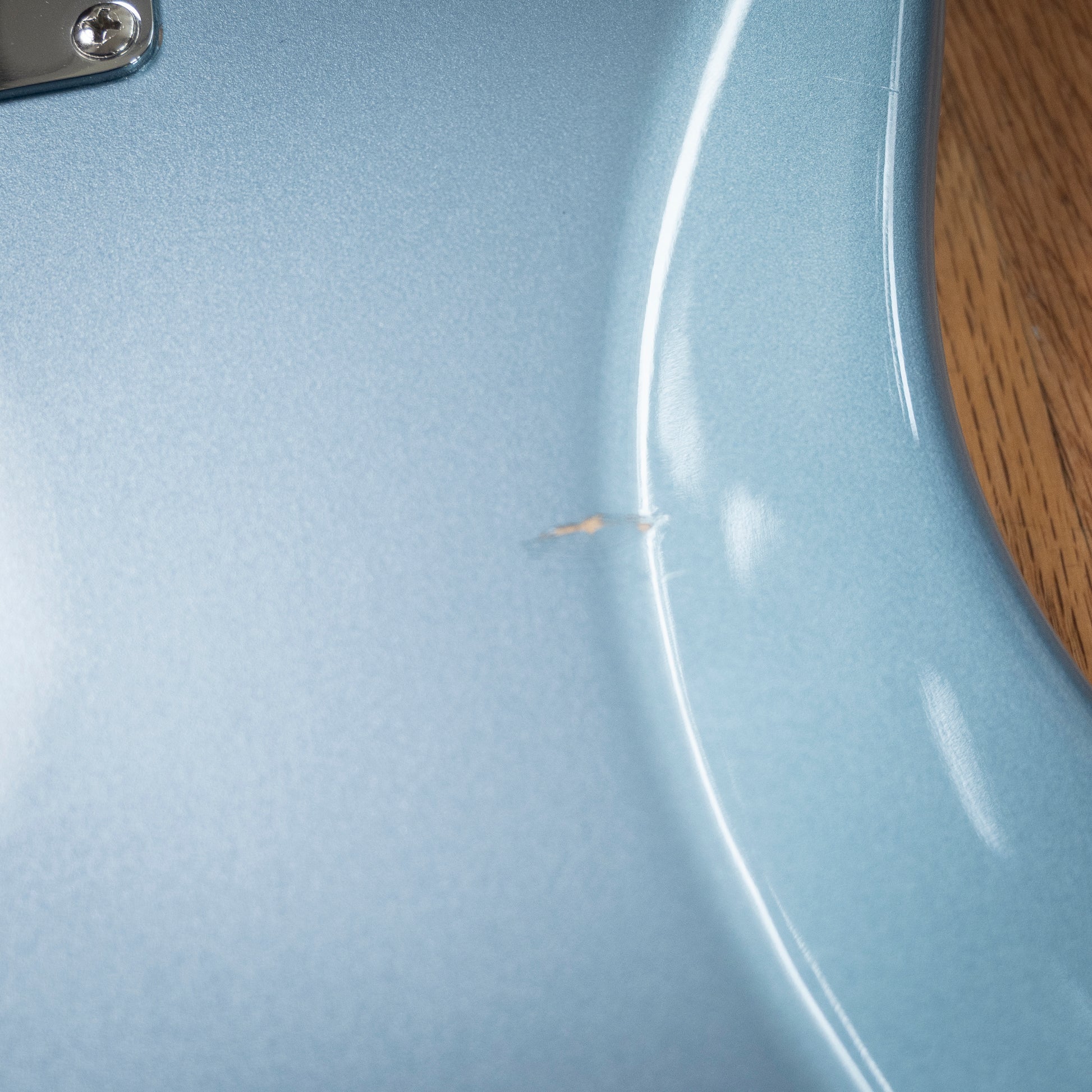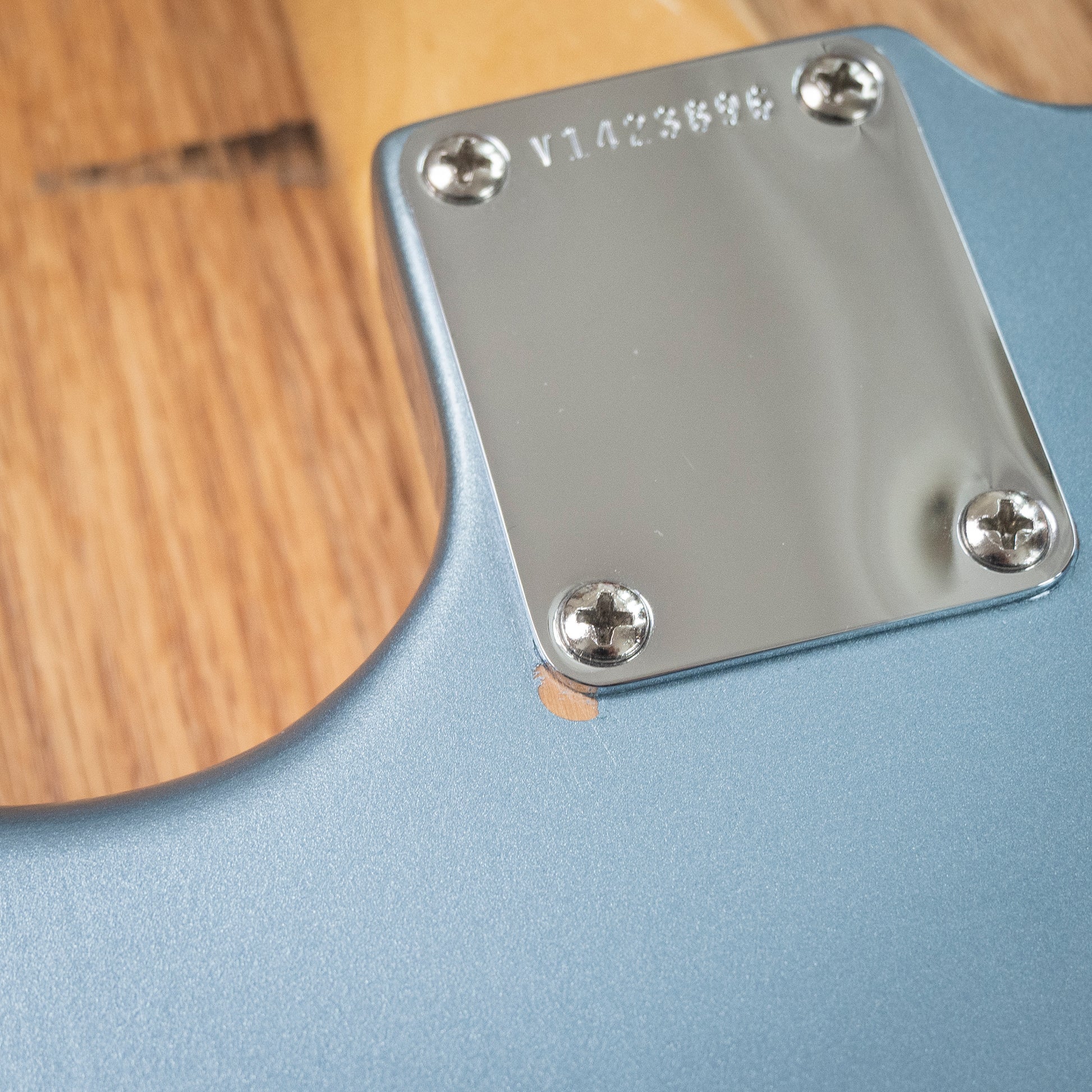 The American Vintage series is known for faithful recreations of classic-era Fenders, and this Jaguar delivers with vintage-correct pickups, bound neck, and matching large headstock. The finish—Ice Blue Metallic—is rare, classy, and naturally aging with subtle wear, giving it even more vintage charm.
