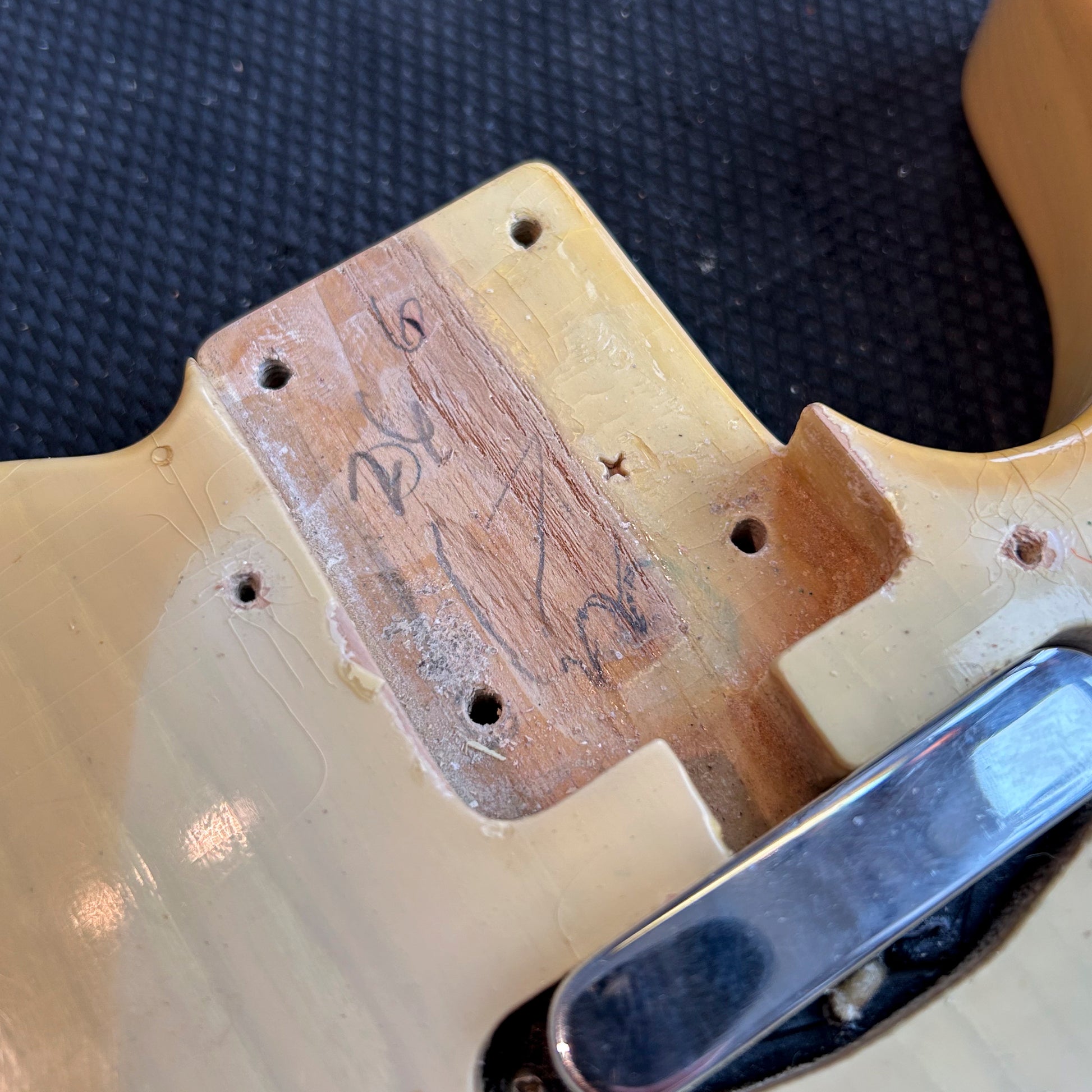 The frets are original and still playable across the neck. The bridge pickup is original as well, while the neck pickup has been replaced to a Seymour Duncan Antiquity. The pots and wiring follow the original schematic and remain intact.