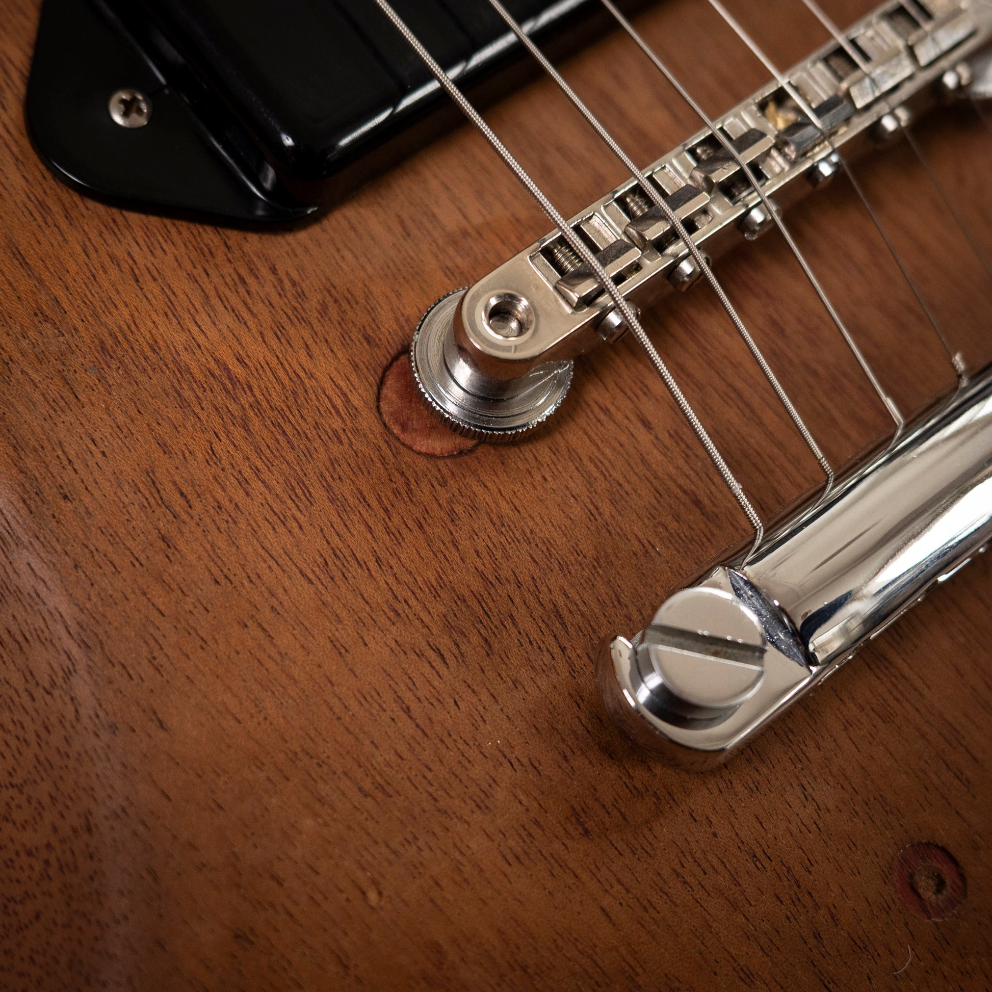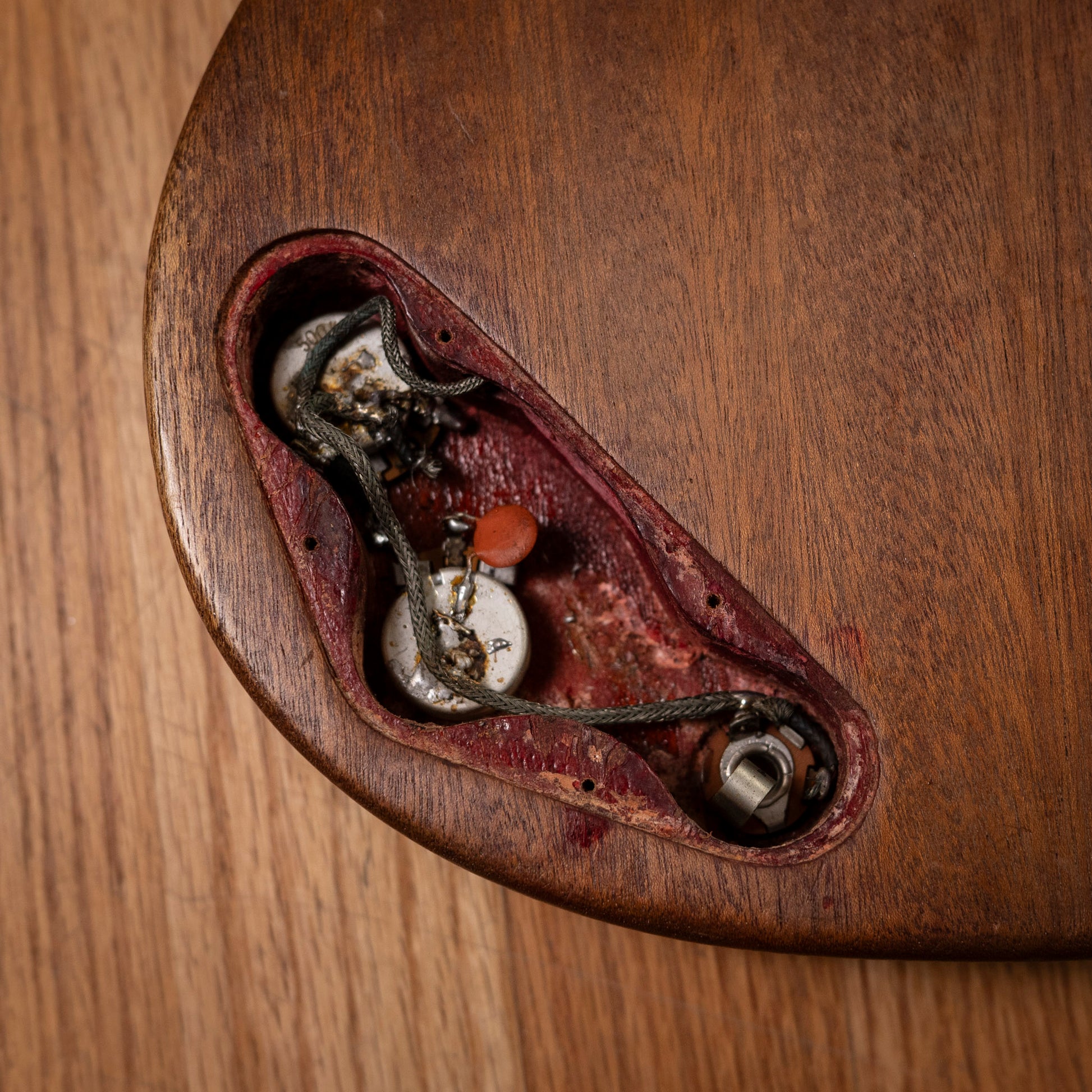 This example has been heavily modified, making it an ideal player-grade vintage piece rather than a collector-grade original. The original finish has been stripped, giving the guitar a unique, worn-in aesthetic that highlights the natural wood grain. Additionally, the bridge post holes have been filled and relocated, indicating a past modification to improve setup or intonation.