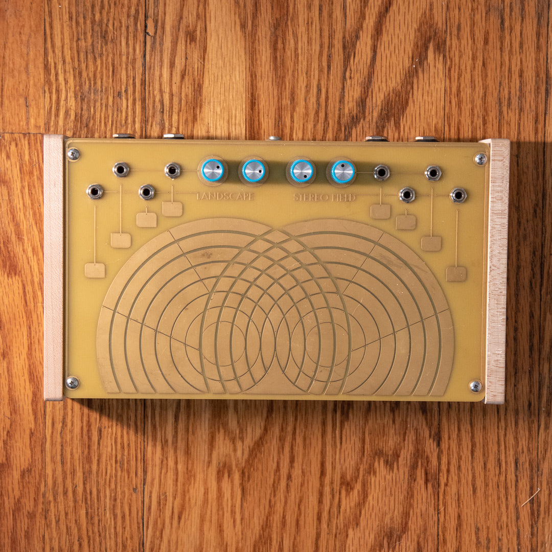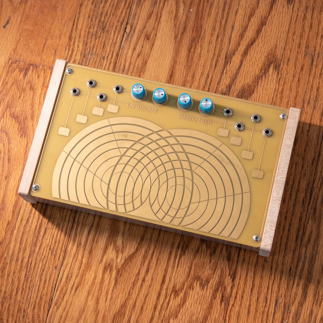 STEREO FIELD is one instrument with three uses. It is simultaneously a stereo/quad modular touch plate feedback atonal synthesizer, a stereo/quad audio processor and a pressure sensitive chaotic CV "controller". All three uses are available separately as well as simultaneously and in conversation with each other. The Stereo Field allows its user to manipulate and patch two analog stereo preamp circuits via touch plates. By utilizing skin conductivity as new paths for current to follow you are creating "new circuits" and new sounds in relation to where your fingers are patching.
