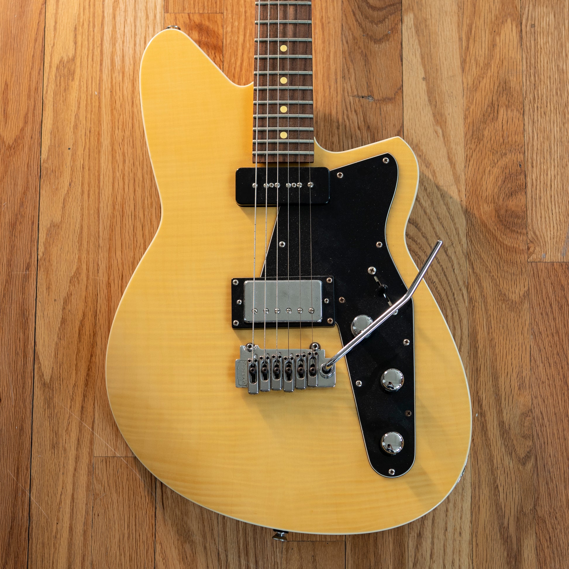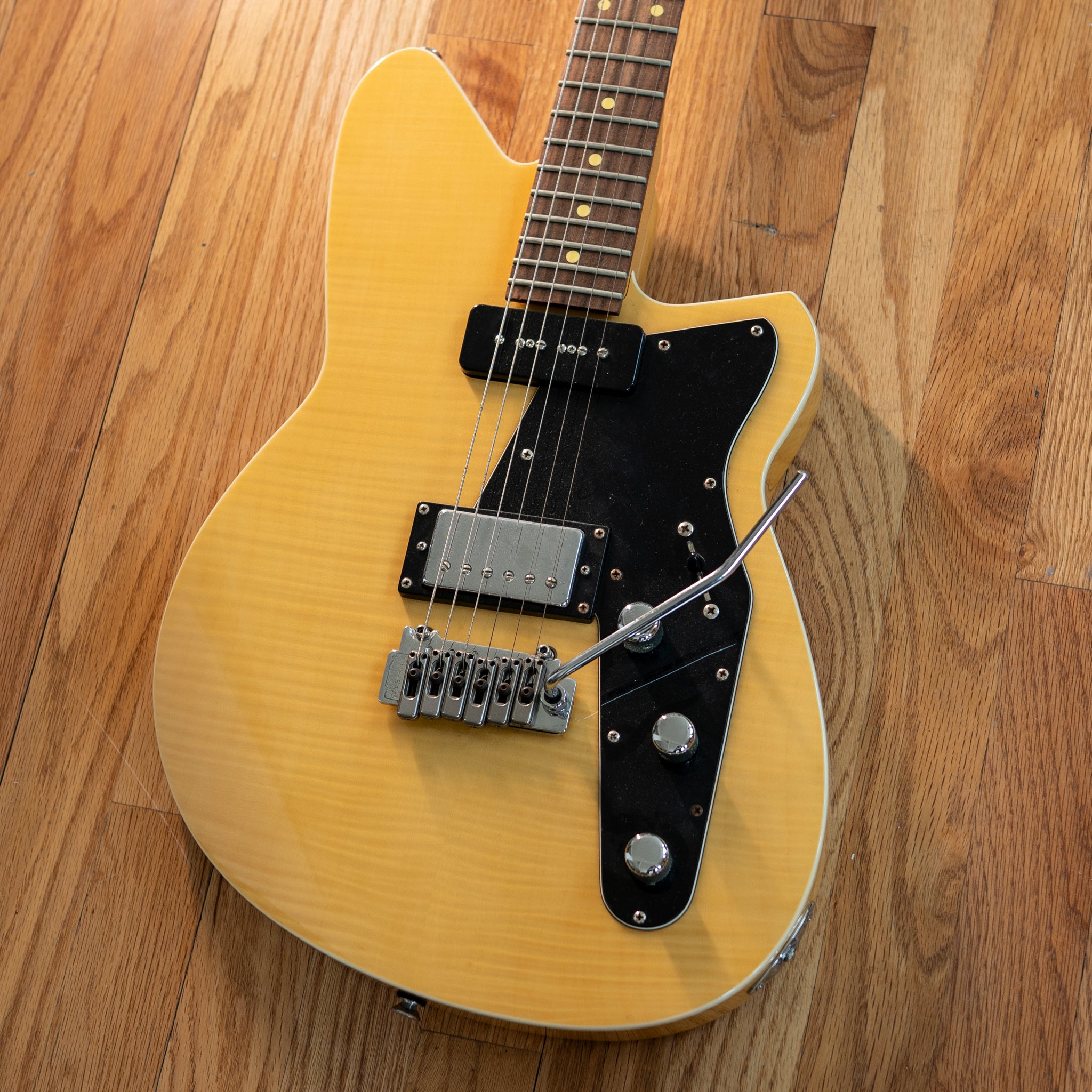 This Reverend Double Agent is looking excellent with this flamed maple top! It plays evenly across the fretboard and rings out clearly. Shows signs of play wear but in overall good shape. Includes original hardshell case.