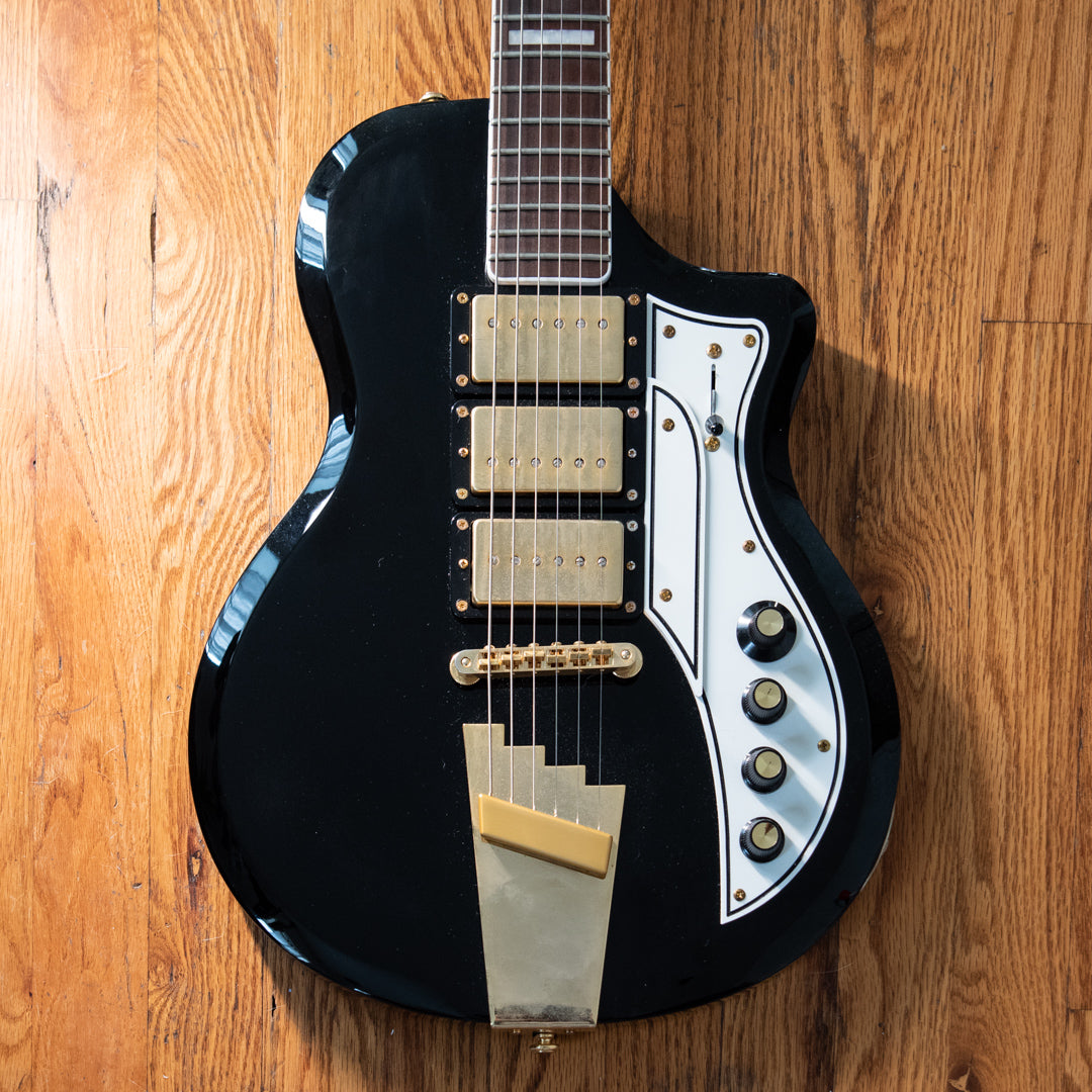 The Supro Tri-Tone reissue is a faithful recreation of a classic guitar. This deco designed three pickup model was made popular by David Bowie, and Link Wray.